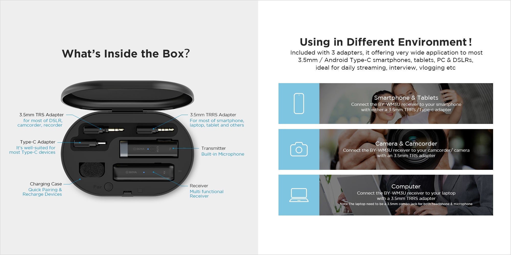 BY-WM3U is designed with a Type-C charging carry case that provides vital protection for storage and transit but also provides a rechargeable 1000mAh internal battery allowing you to charge your system anywhere. Perfect for creators who are always on the go, and don’t need to worry about no power. You can even charge the storage case with a USB power bank, isn’t it convenient? One-time full charging can support the transmitter/receiver to continue working 4.5 hours/ 8 hours.