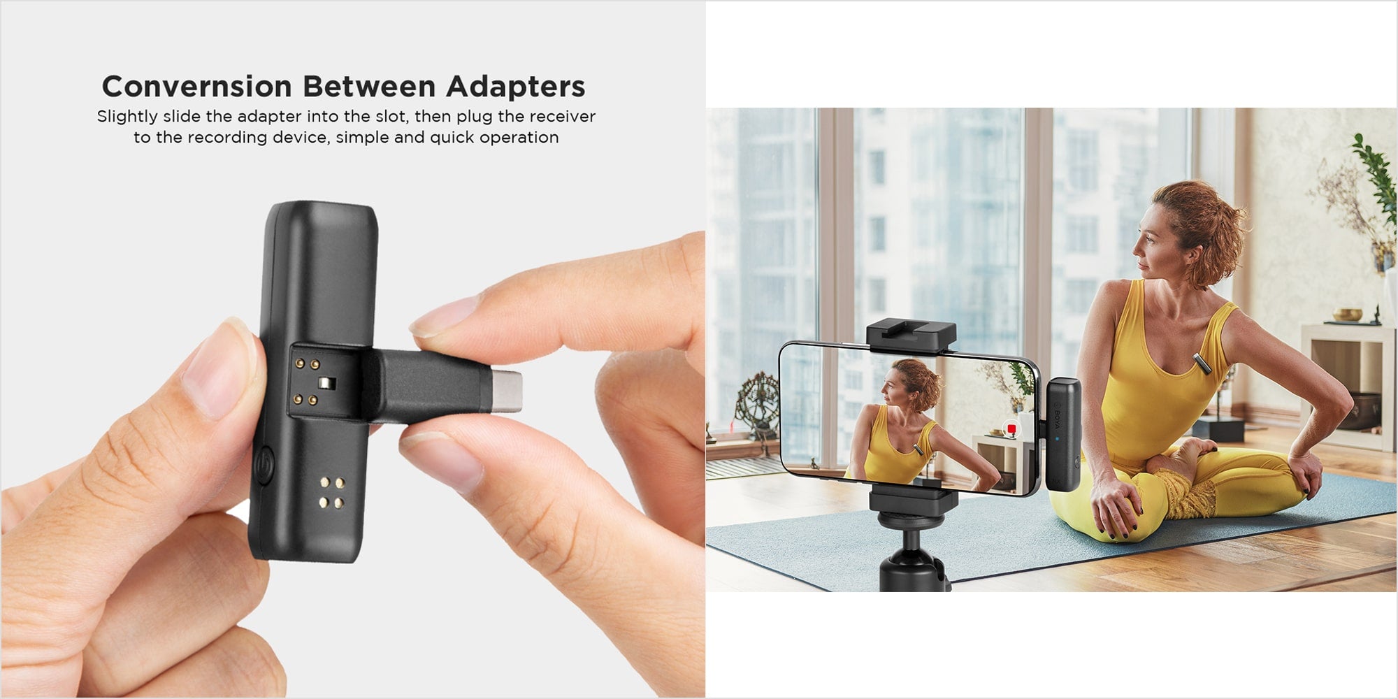 The receiver comes with a Type-C adapter, a 3.5mm TRS, and a 3.5mm TRRS adapter, it is compatible with Android smartphones, tablets, and computers with USB-C connectors, DSLRs, camcorders, recorders, etc. The transmitter comes with a foam/fur windshield, it can effectively reduce environmental noise.